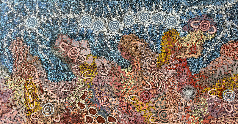 Aboriginal art communicates complex spiritual and cultural narratives through iconography. These symbols convey Dreamtime stories—foundational beliefs that explain creation, laws, and rituals. Examples incorporate a variety of media, from ochre paintings on bark to eye-stopping works in neon, acrylics to canvases, as well as video and photography. The works underscore the deep connection between artists and their land, a notion that has survived for thousands of years among these Indigenous people. The art represents 40 years of collecting and many pieces have never been seen outside Australia.